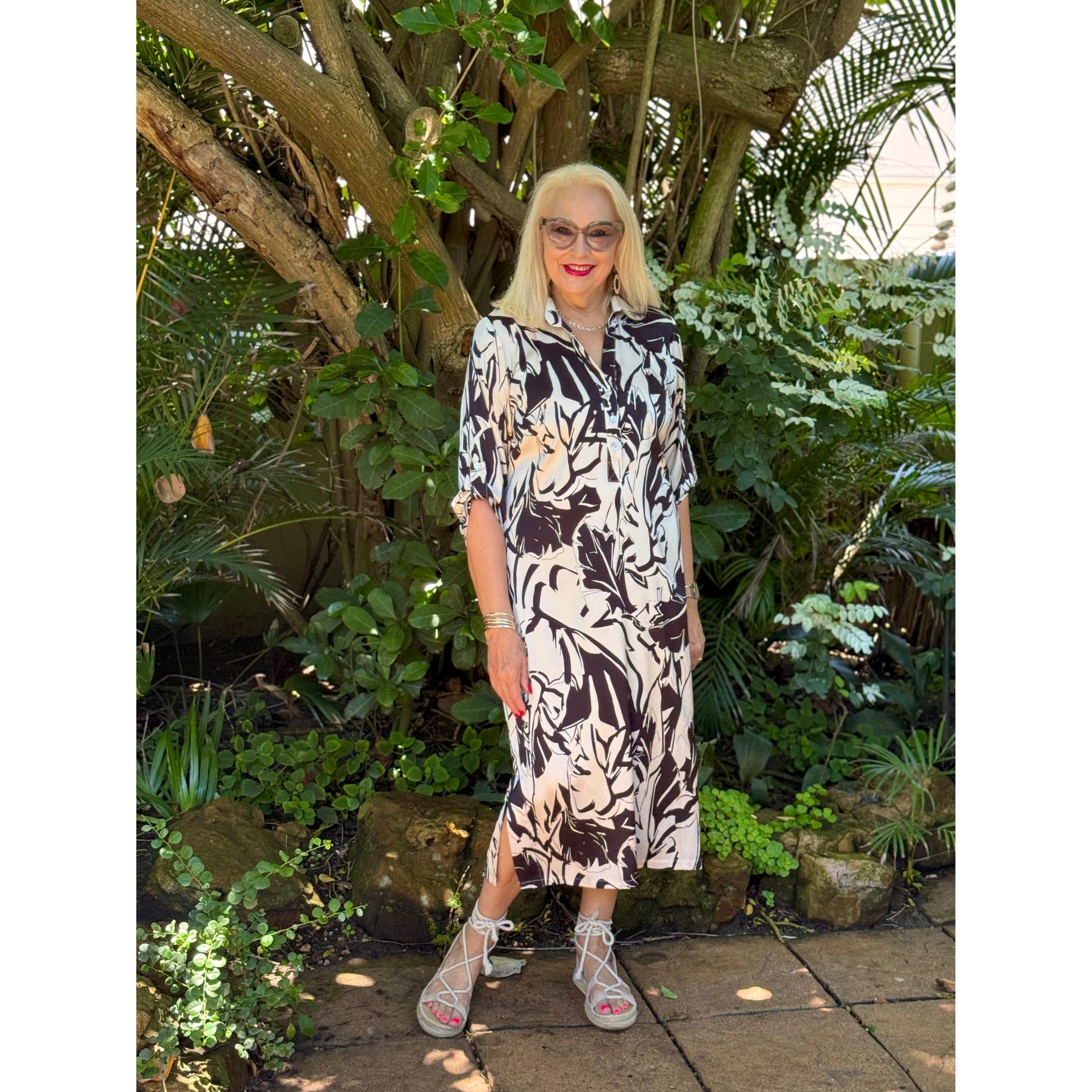 Eden is a calf length shirt dress that boasts a comfortable fit and a collared v-neckline, with button detailing. The sleeves can be worn straight or generally are clasped with a button, allowing for versatile sleeve options. The two slits on either side allow for easy movement, and is extremely comfortable, stylish and functional.