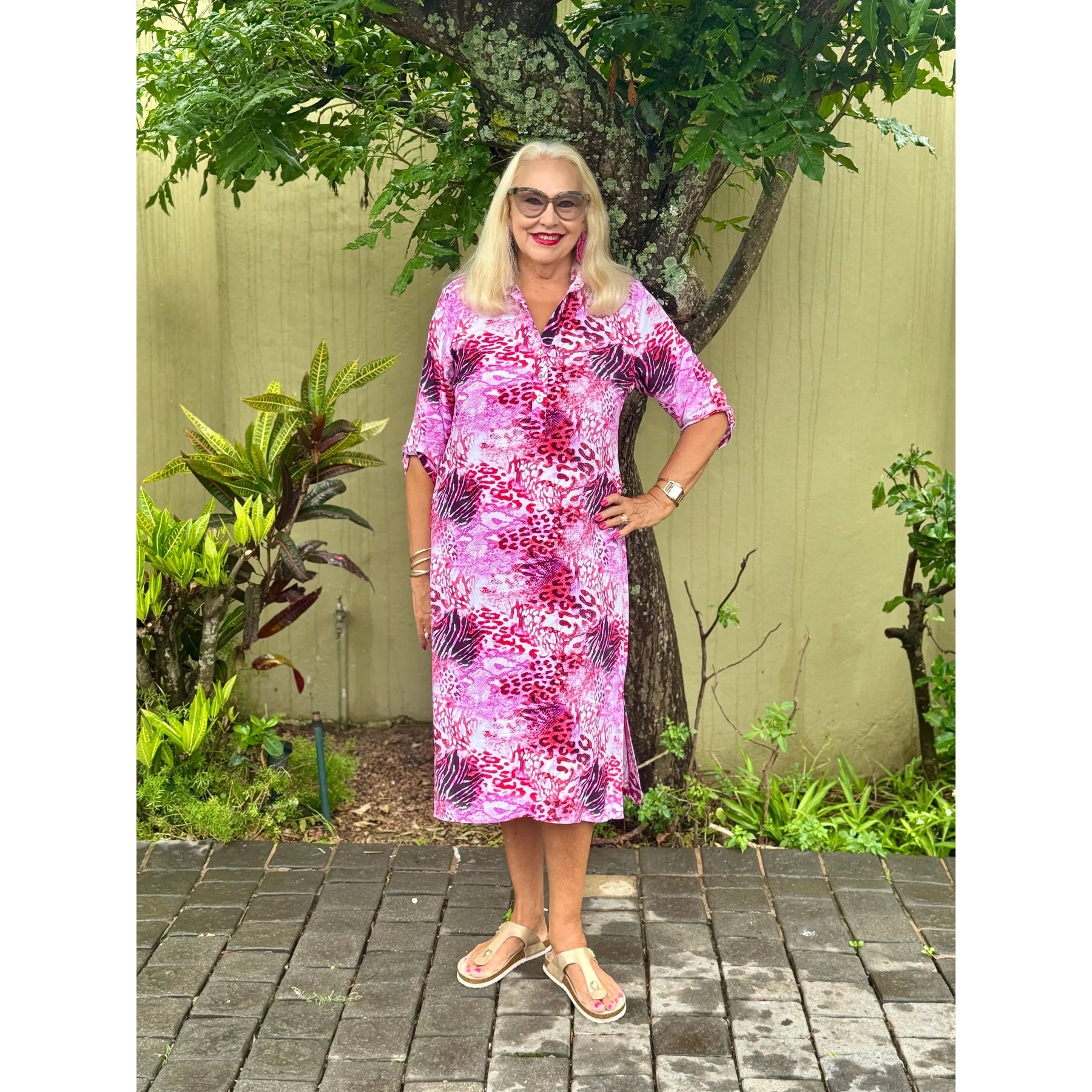 Eden is a calf length shirt dress that boasts a comfortable fit and a collared v-neckline, with button detailing. The sleeves can be worn straight or generally are clasped with a button, allowing for versatile sleeve options. The two slits on either side allow for easy movement, and is extremely comfortable, stylish and functional.