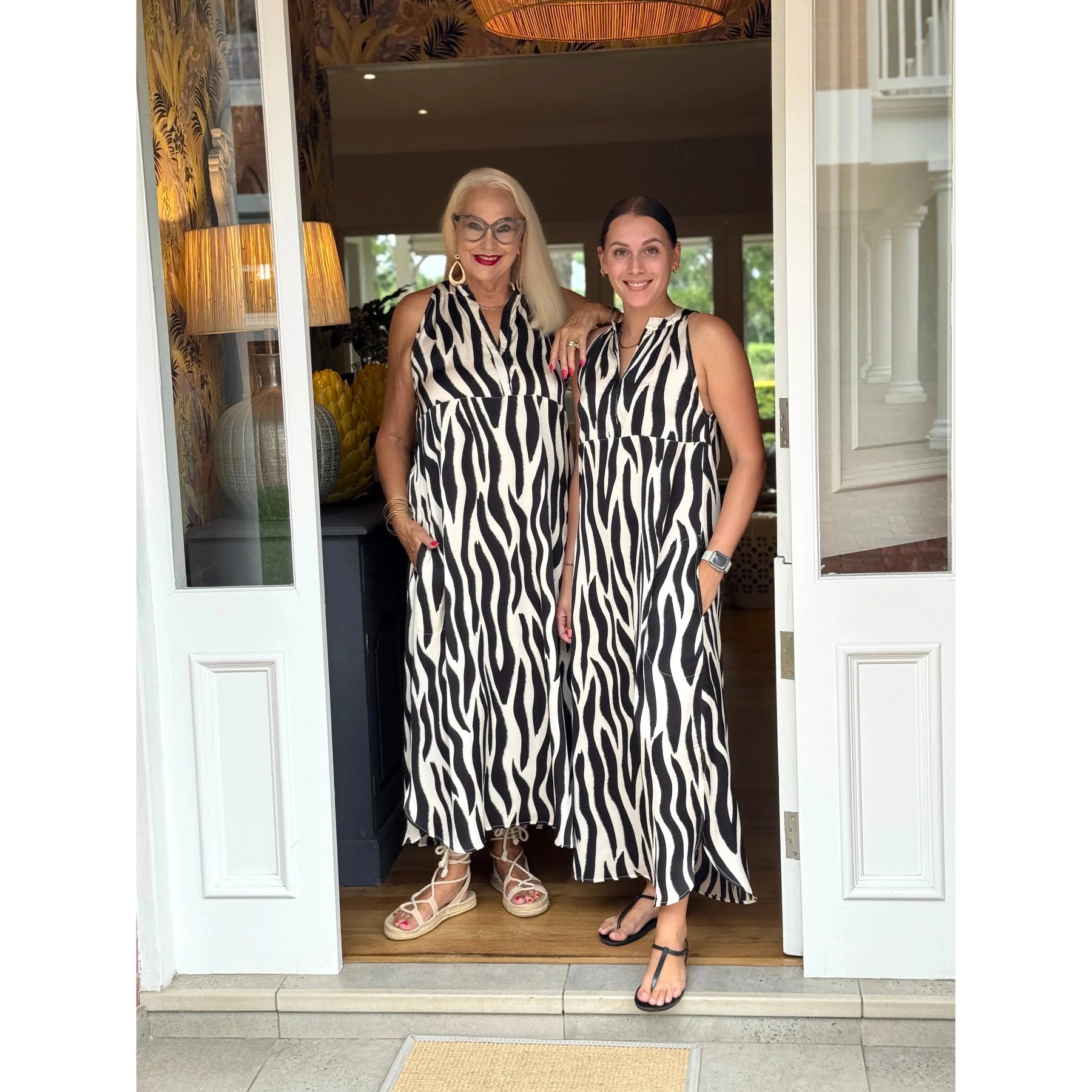 Long, flowing silhouette dress with a relaxed A-line shape that flatters effortlessly. Designed with practical pockets and a stylish cut away arm and neck detail