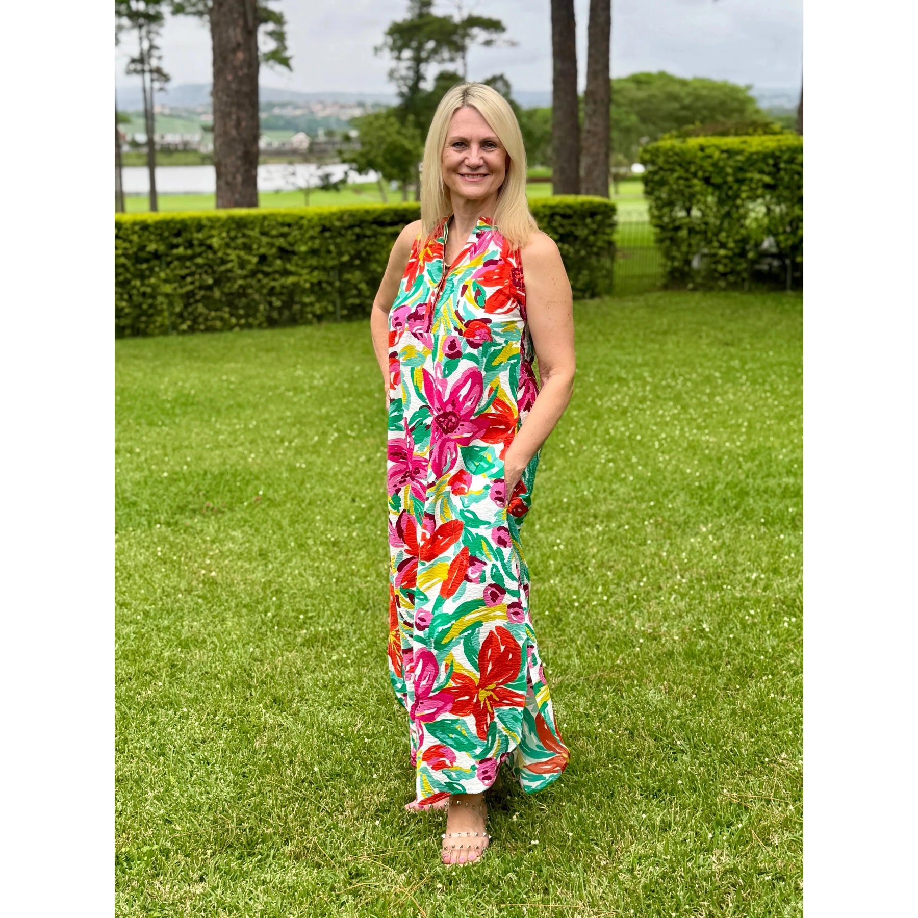 Long, flowing silhouette dress with a relaxed A-line shape that flatters effortlessly. Designed with practical pockets and a stylish cut away arm and neck detail.