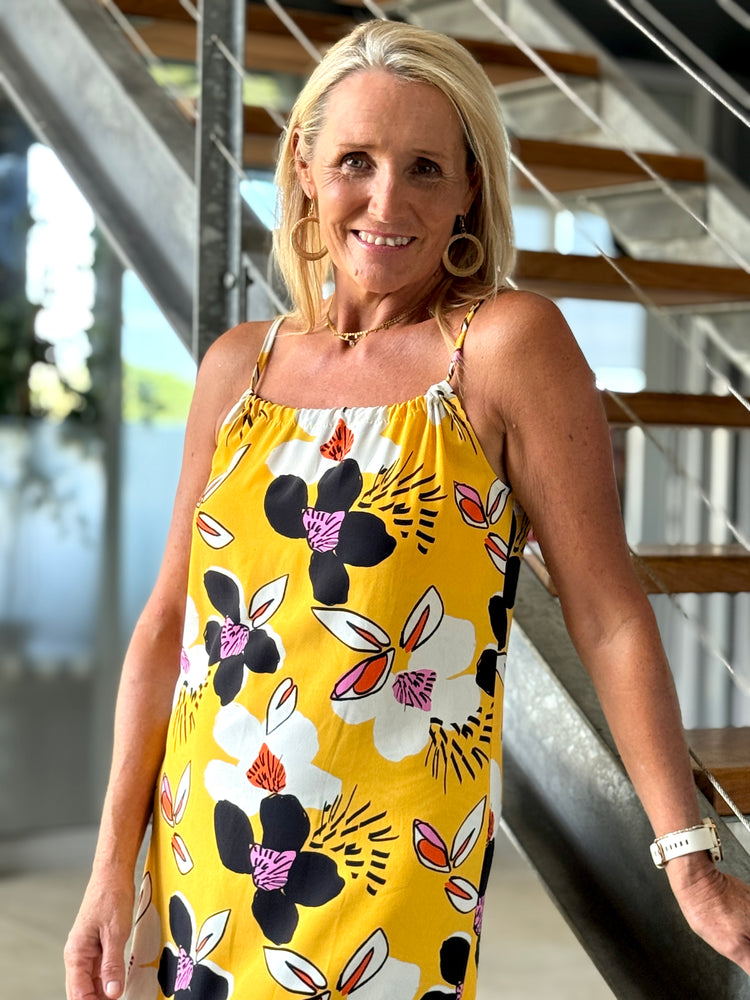 A loose, calf length (3/4 length) dress with thin straps which tie at the back and slits up each side. Can also be worn with a thin fabric belt in the waist.
