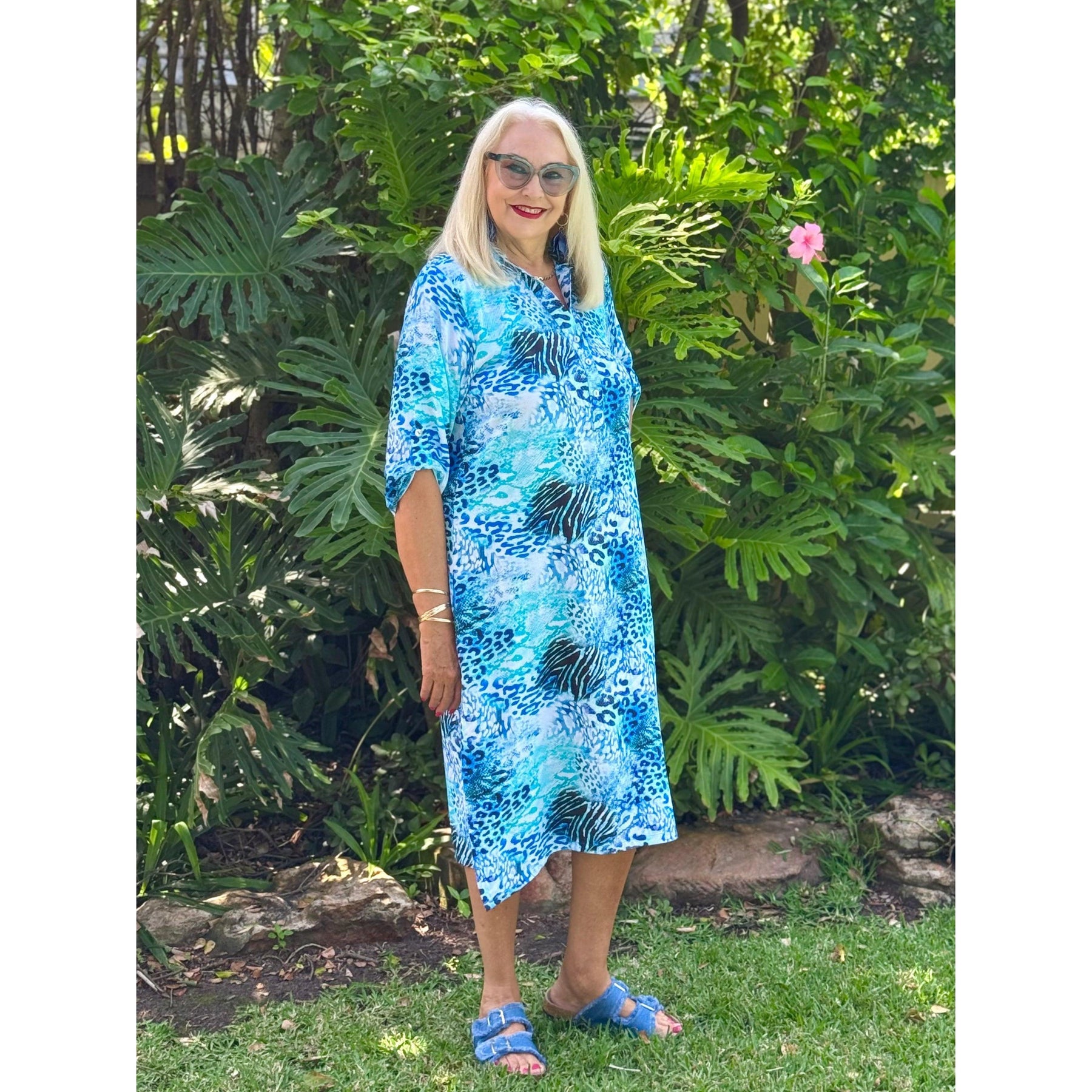 Eden is a calf length shirt dress that boasts a comfortable fit and a collared v-neckline, with button detailing. The sleeves can be worn straight or generally are clasped with a button, allowing for versatile sleeve options. The two slits on either side allow for easy movement, and is extremely comfortable, stylish and functional.