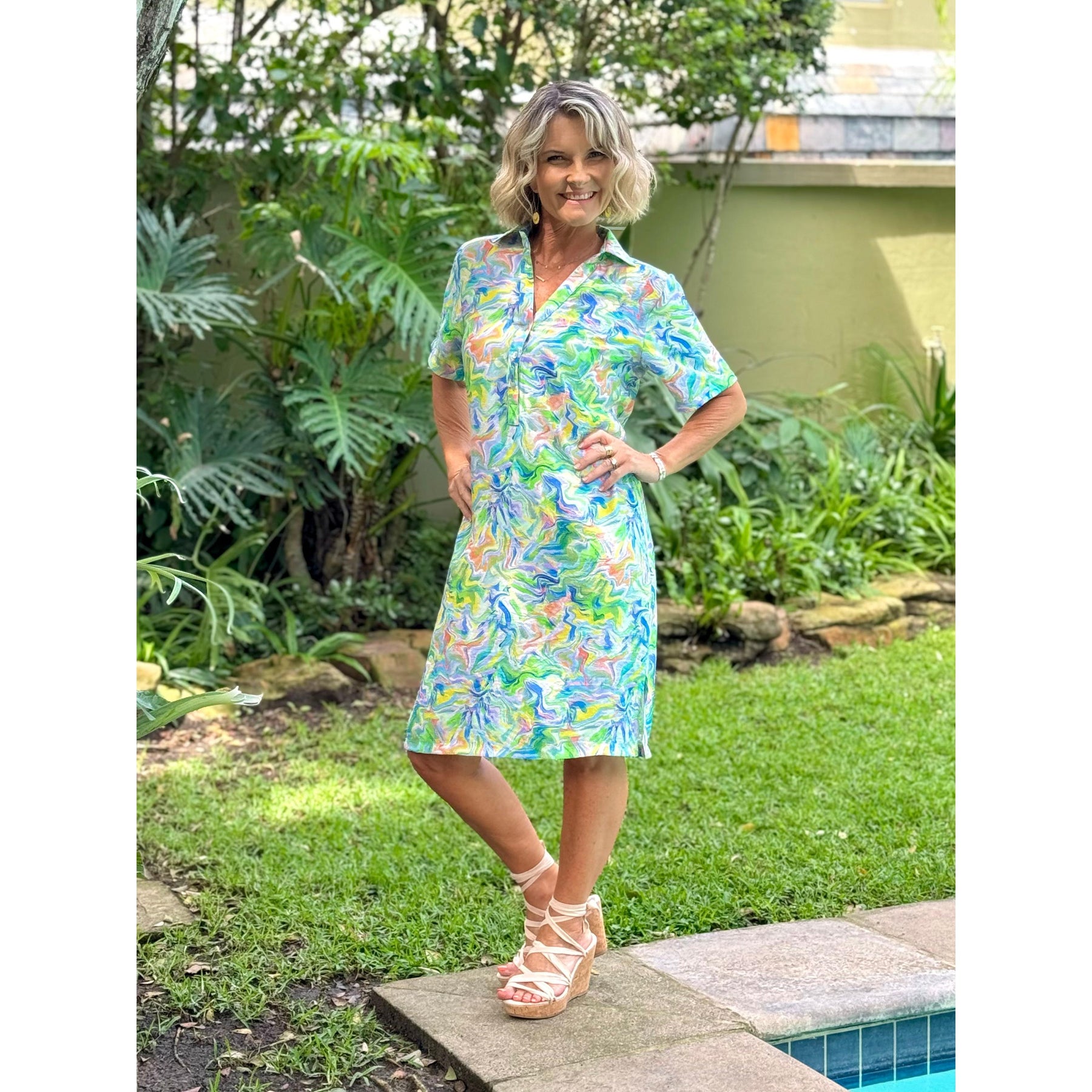 Tatum is a knee length shirt dress that boasts a comfortable fit and a collared v-neckline, with button detailing and short sleeves. The two slits on either side allow for easy movement, and is extremely comfortable, stylish and functional.