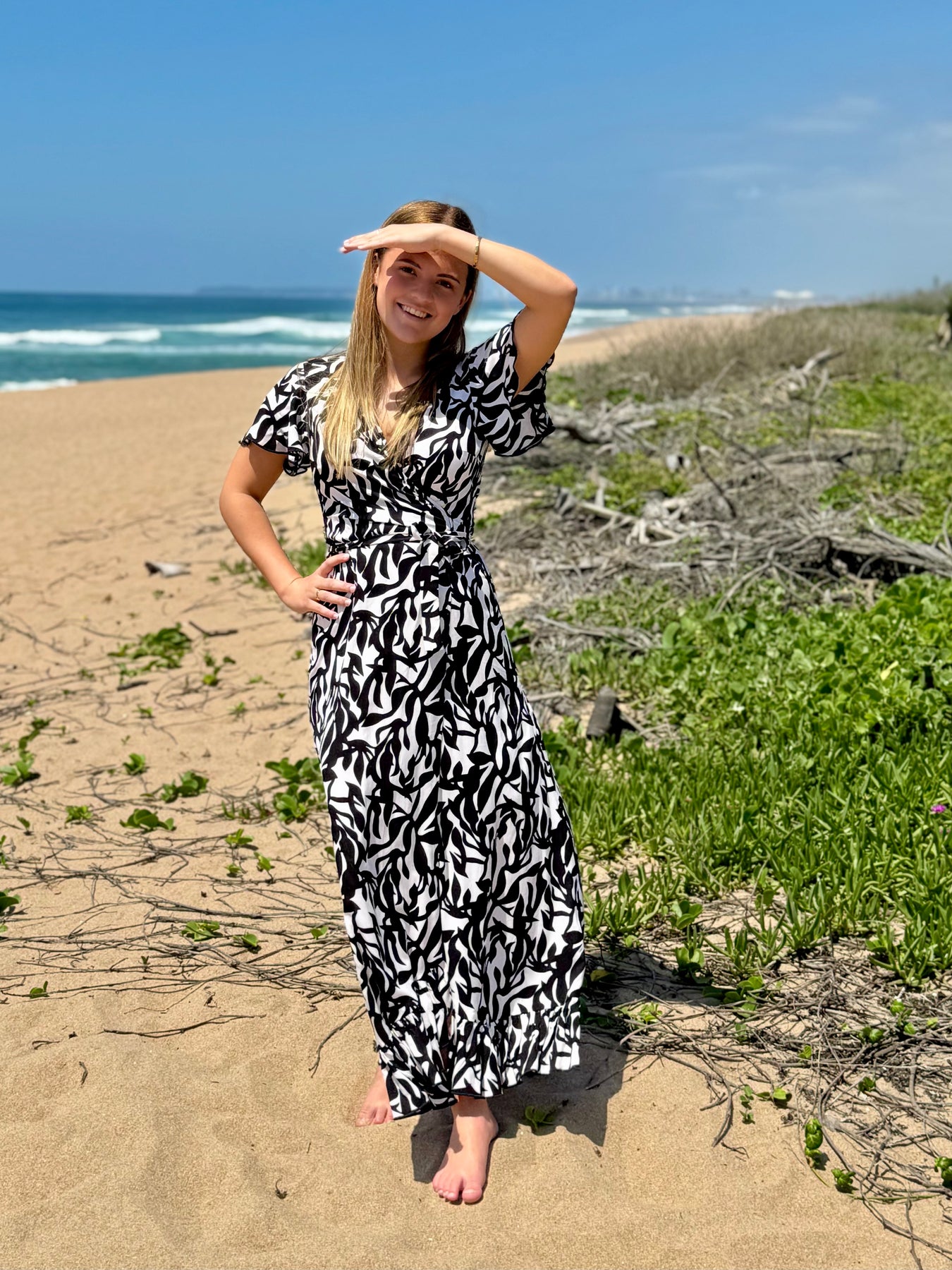 Rosie is a feminine long length wrap dress, featuring a delicate frill hem that moves gracefully with every step.