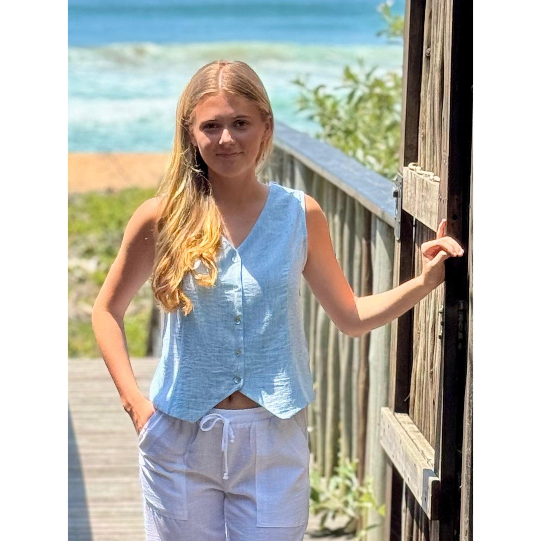The Tayla is a sleeveless tailored waistcoat style top, which can be worn on its own for a smart or casual look and pairs perfectly with a feminine skirt, casual pants , jeans or shorts depending on the look required.