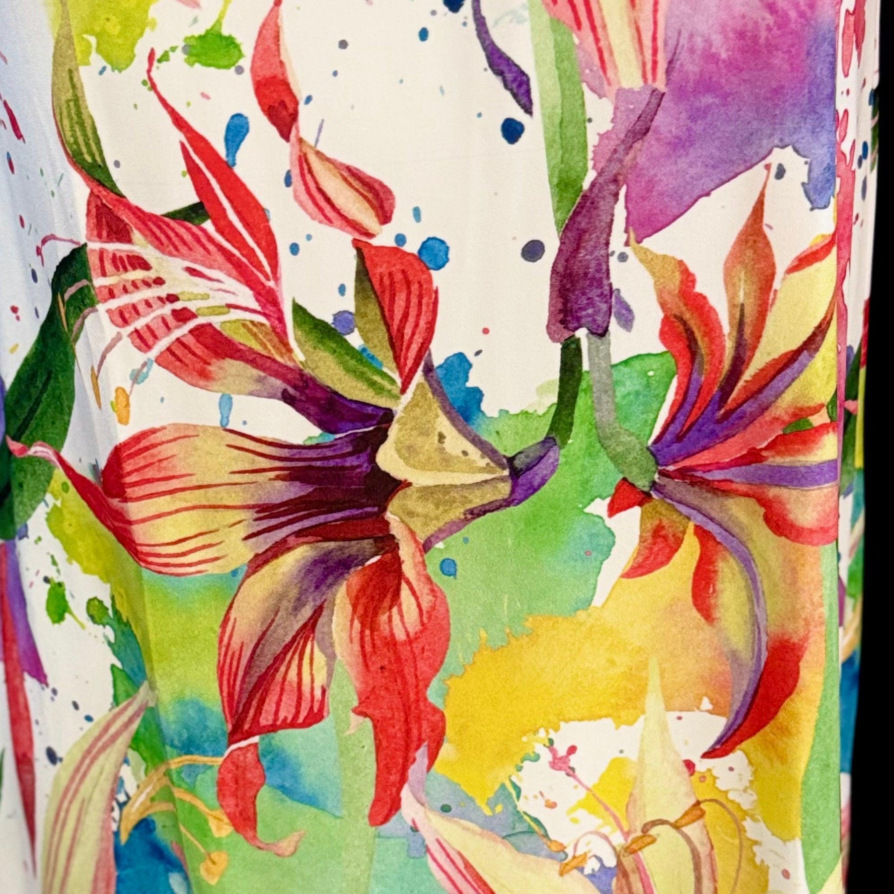 The fabrics are our own prints on a slinky ventia, which travels beautifully as there is no ironing required. Simply wash and hang.