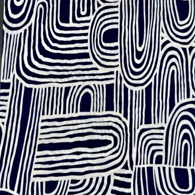 Fabric is an embossed navy and white bon bon.