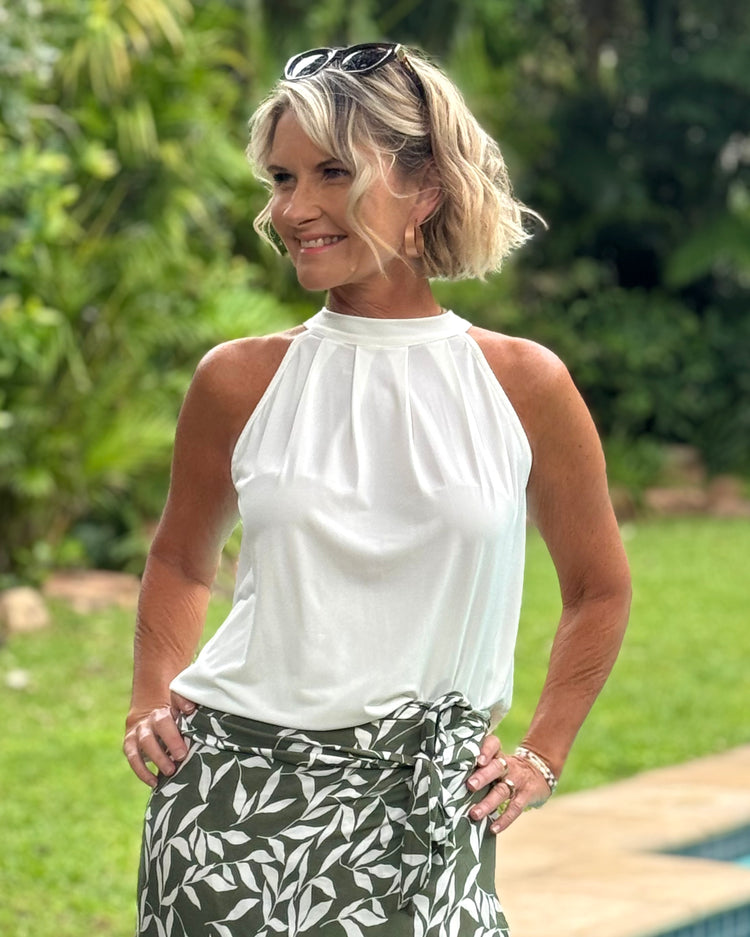 This 3/4 length skirt is designed with ample fabric to wrap around and create a flattering silhouette. It features a delicate pleat detail on the tummy and adjustable ties that can be tied into a charming bow or knot. The skirt is cut to gracefully cross over at the front and form a subtle inverted 'V' near the shins for a standout look.
