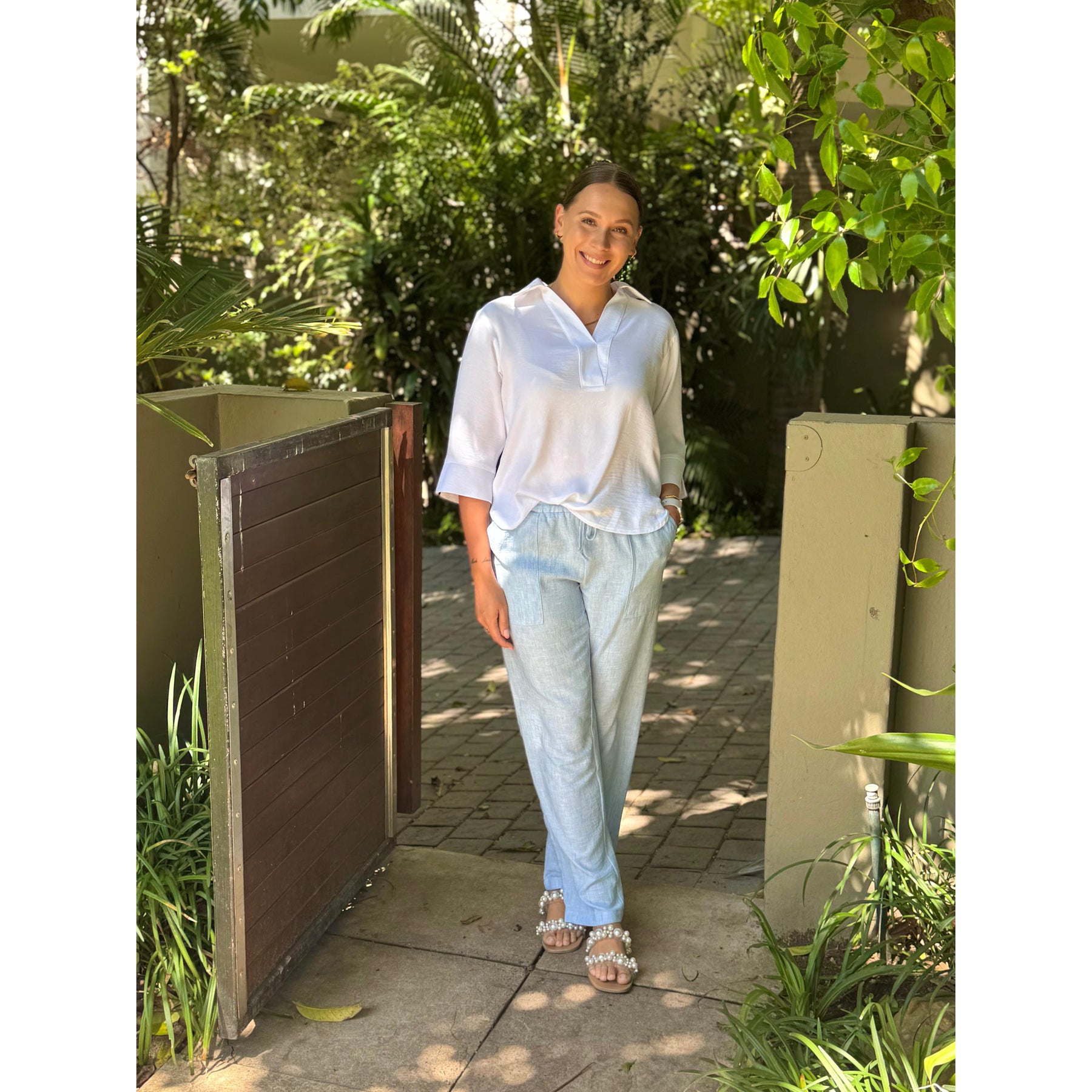Our Alex pants feature an elasticated waistband with a drawstring, front pockets, and are a straight-leg cut.